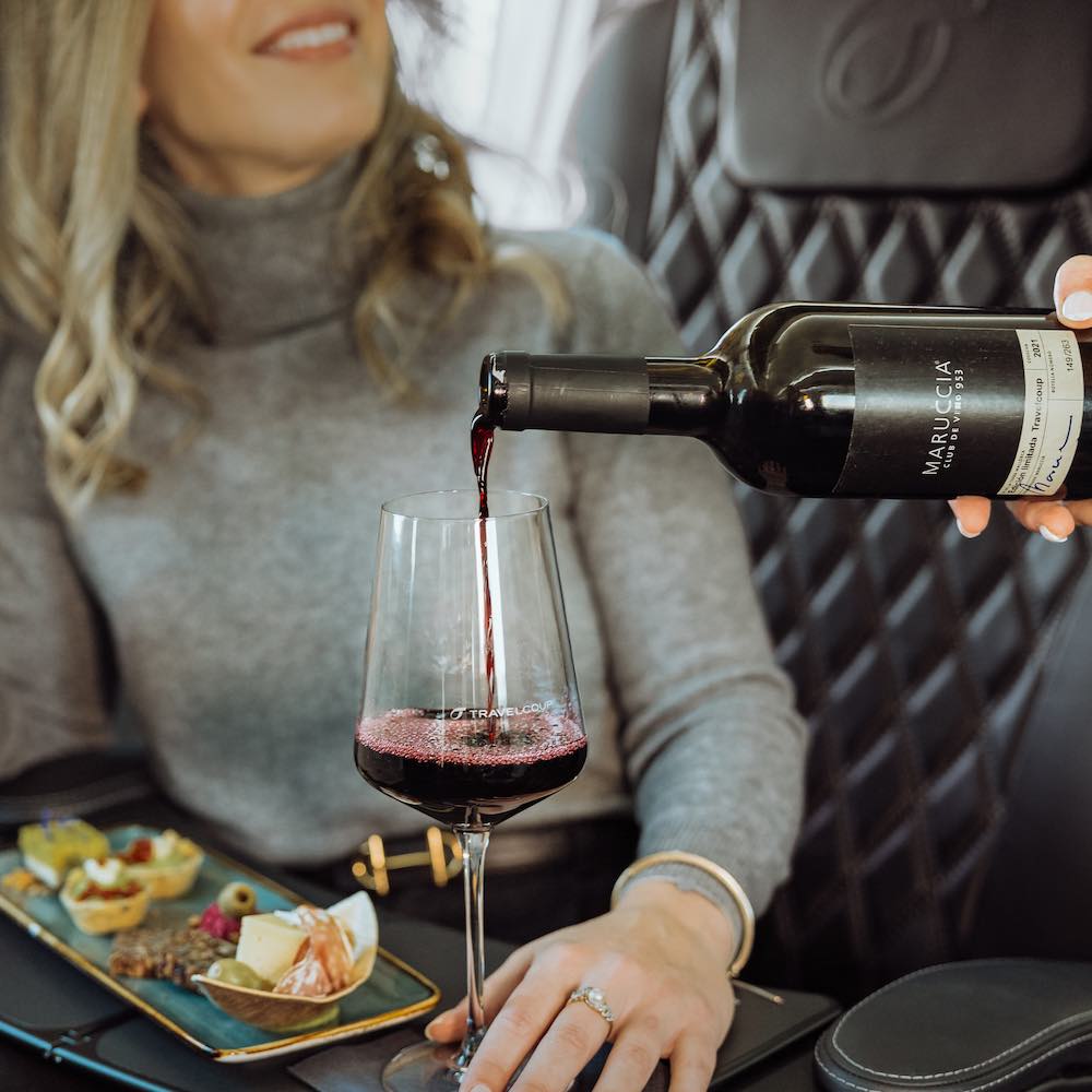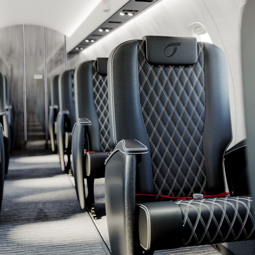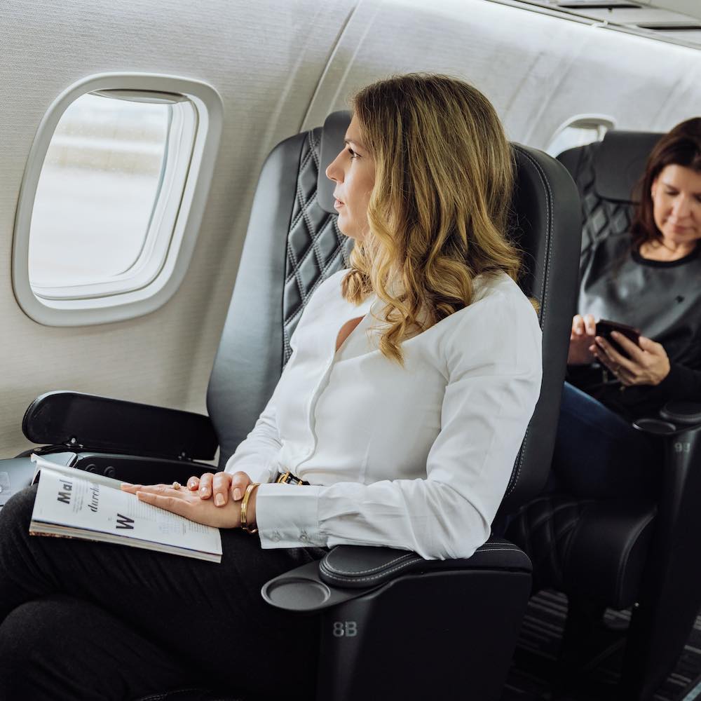 Es erwarten Dich 22 luxuriöse Ledersitze. Mach es Dir bequem und genieße nach dem Start Gourmet-Snacks und Getränke an Bord.